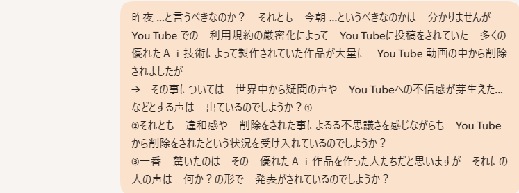 今回の You Tube においての 優れた Ai作品の 削除事案に 対しては 確かに不満はありますが You Tube に向けての批判や 攻撃をするものではありません
