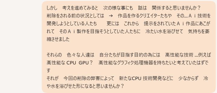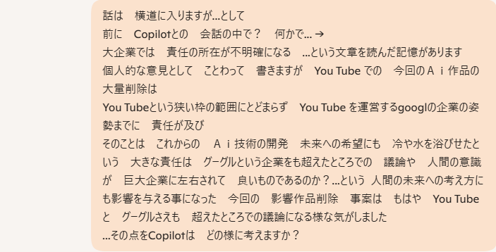 その会話は まだ 続くとは思いますが 一応 ここで その様に Copilot と Ai作品の削除事案について やり取りをした 会話を 記録として残すことにしました