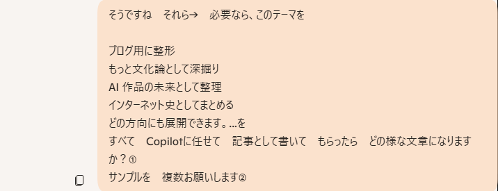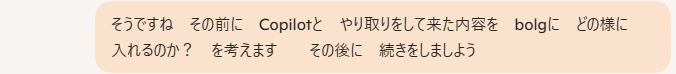その様に Copilot との 会話をしたもの には 会話をした時点での 時間的な 流れの整理をしたものではない形での Page へのCopy になります
