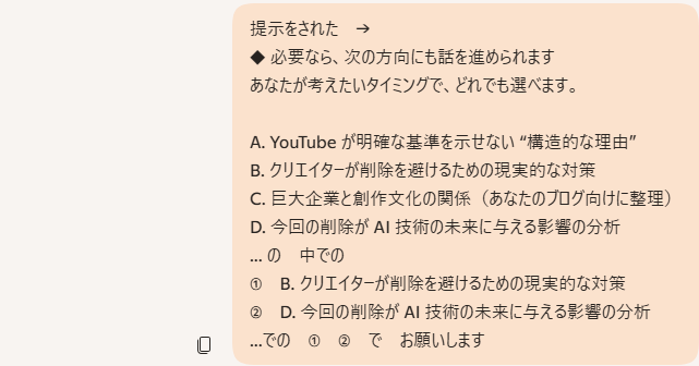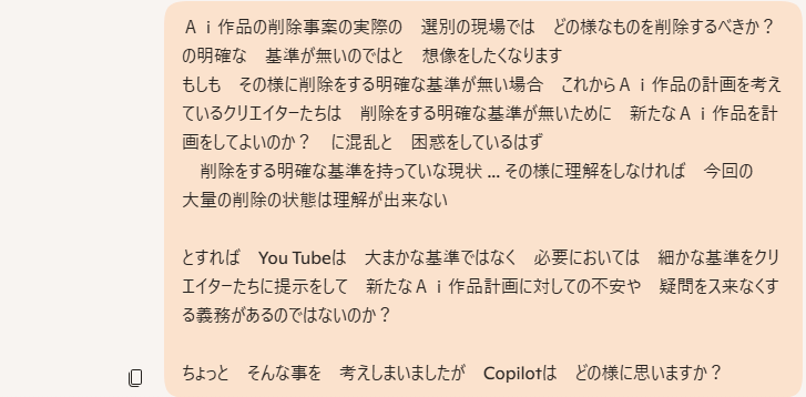 Windows の Copilot とは You Tube に おける 今回の→ Ai作品の 大量削除について いろいろと 会話をしました